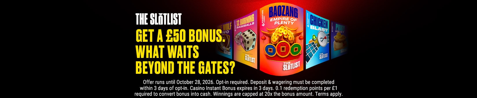 To turn your Casino Instant Bonus (and any winnings) into cash that can be withdrawn, you’ll need to play selected slots to earn redemption points. These slots include our latest Slotlist titles – including an exclusive headline act loaded with unique features and fun ways to win big.