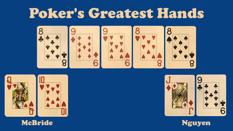 Nguyen showed that indeed he did, and indeed it was all over. McBride’s cards aren’t shown on the broadcast, and Sims and Paulle’s report notes how they weren’t able to see them, either, although later it was revealed McBride had Q♥10♥. The eights full of nines on the board McBride was playing were beaten by Nguyen’s nines full of eights.