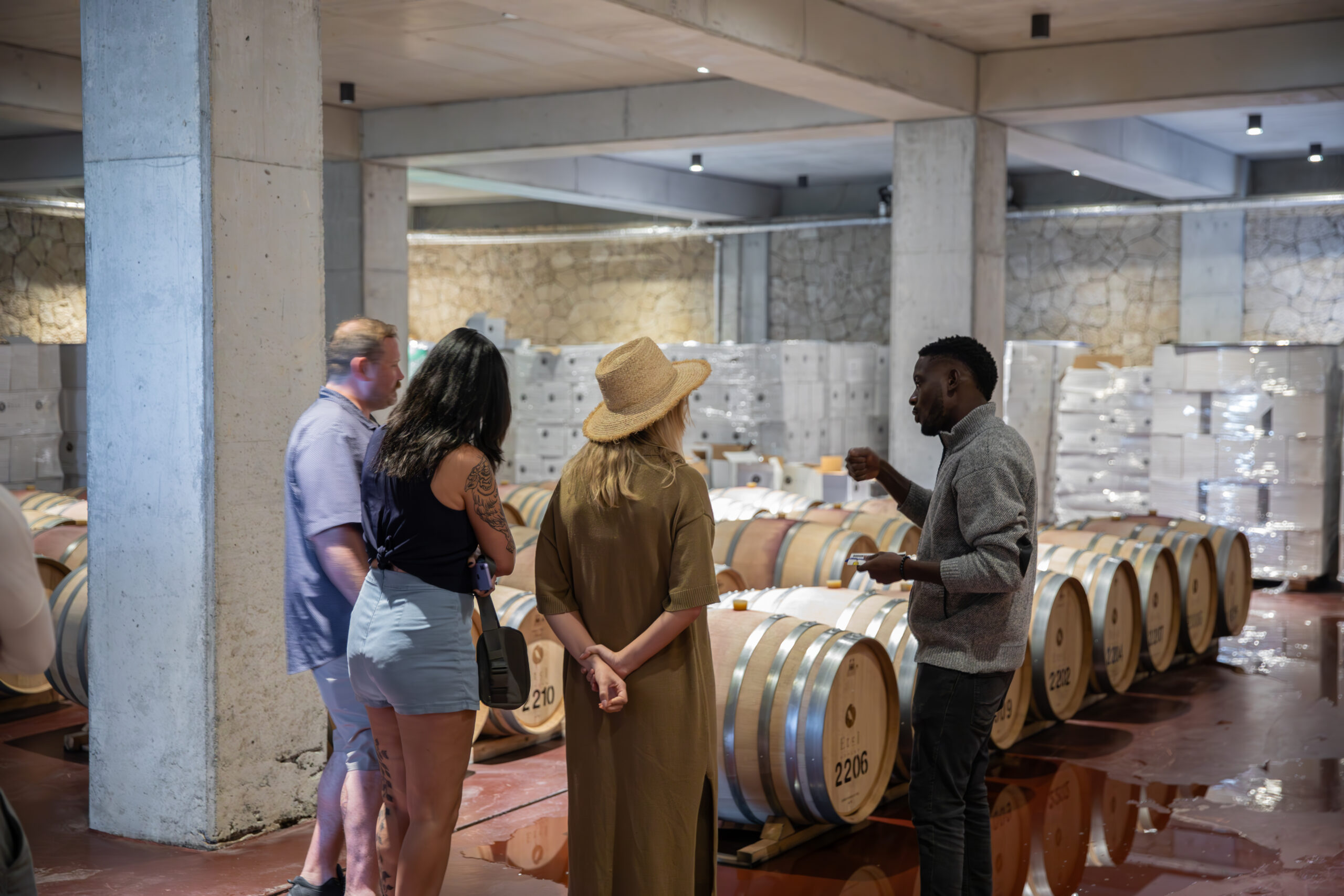 Drinks are finished and we set off to learn about the history of the Etel Winery and the various products it produces (it’s not just wine, but also soaps and olive oil). We stroll through its “wall of fame” where its many awards are proudly displayed, then head down into the chilly cellar, a welcome respite from the heat up above.
