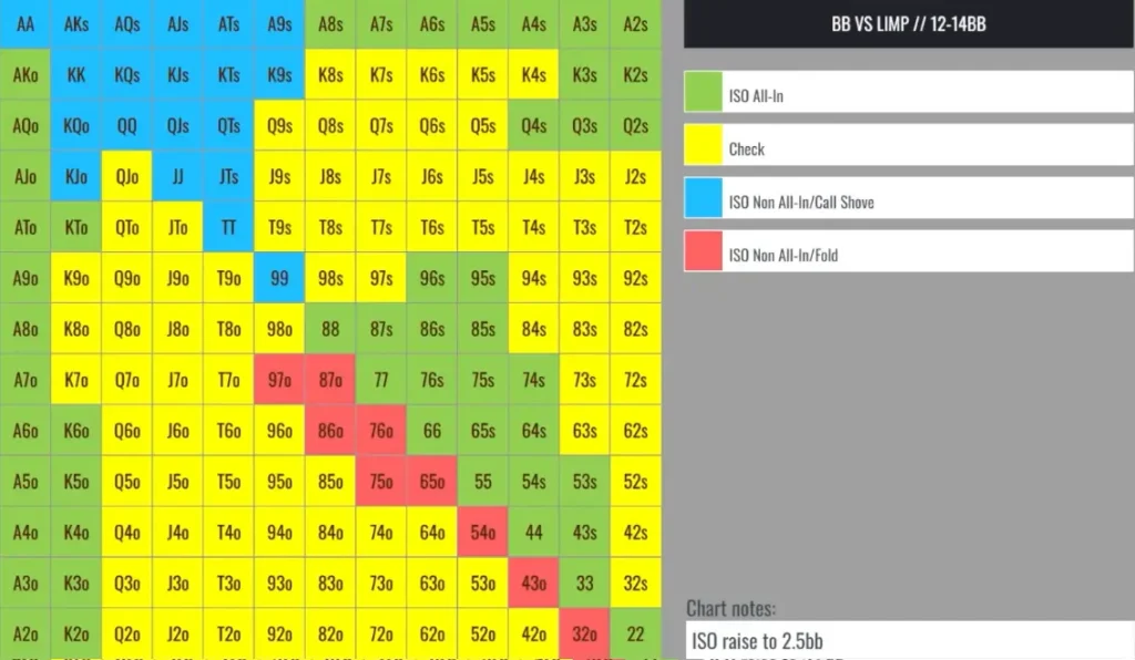 At 12 – 14BB stack depths, you’re going to have a lot more shoves versus limps. Your shoving range here includes most aces, low suited and offsuit kings, low suited queens, and some suited connectors.