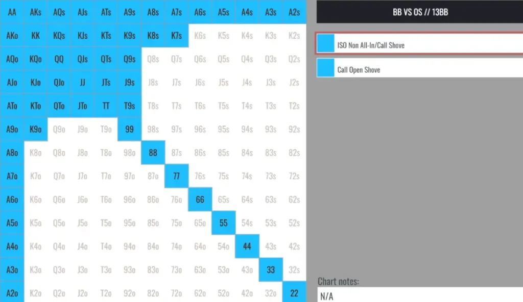 As stacks get shallower, you can call with a wider range. Below you can see the range chart for calling a button shove for 13bb effective. See the Spin & Go Lesson video for range charts for each stack size.
