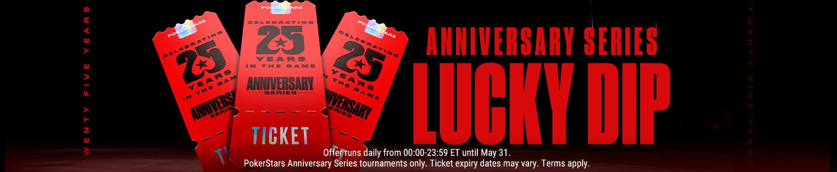 Lucky Dips run daily from May 10-31. To celebrate 25 years of PokerStars, the top prize each day will go to the player who is ranked in 25th place (or joint top prize).