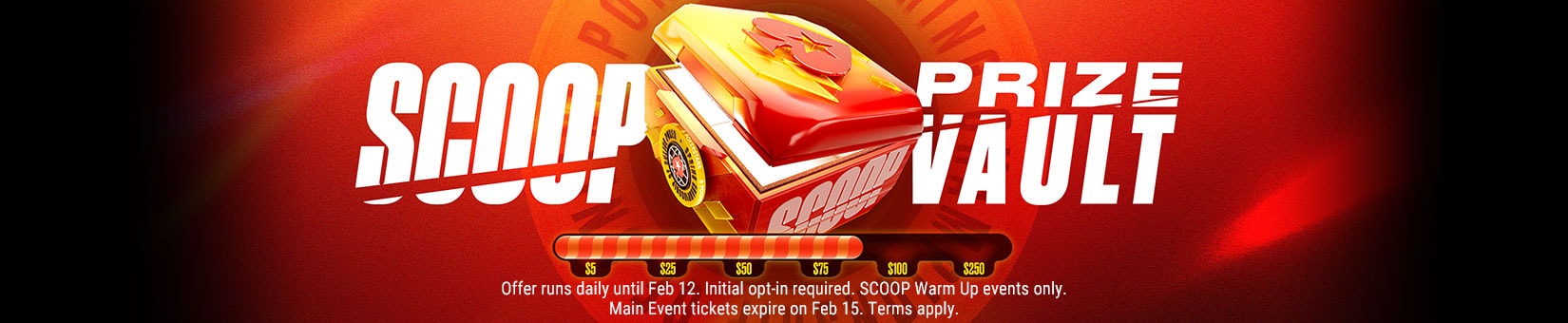 SCOOP Prize Vault is a rake challenge with 6 different milestones. By reaching the first milestone of $5, players earn a locked Chest that contains a Level 1 Prize Draw ticket. With each additional milestone they reach, different random prizes will be loaded into their locked Chest and their chances of winning a higher value prize increases. Prizes are in the form of SCOOP tickets and Prize Draw entries, where SCOOP tickets will also be awarded.