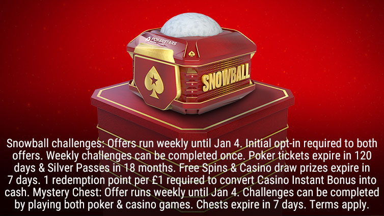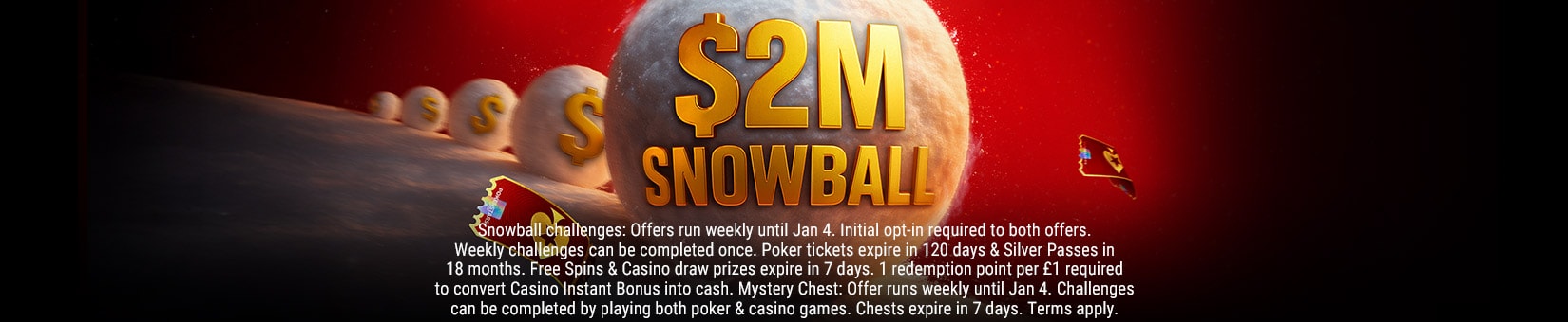 Players who take part in the Poker Snowball Challenge offer can claim entries to weekly Snowball All-In Shootout tournaments and when they complete poker challenges during weekly offer periods, as specified below, they will earn entries to weekly prize draws where they can win poker prizes.